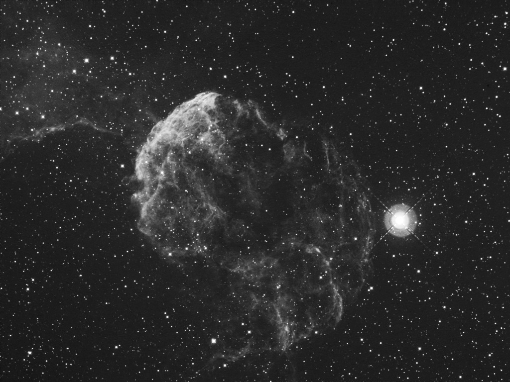 | Supernova remnant IC443. Distance: about 5000 ly. The bright star is Propus, M3.3 Thirteen 20 minute exposures. Filter: Custom Scientific 4.5nm H-alpha. Guidestar: 9 Geminorum, M6.3. |