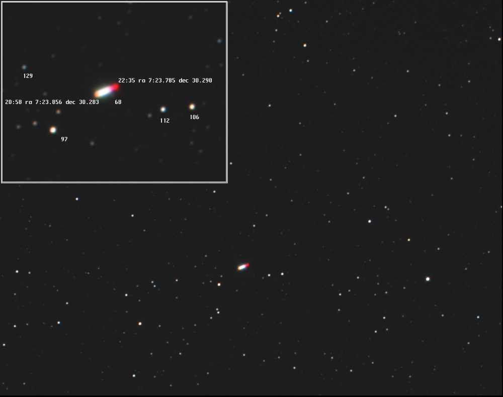 | The astroid Ceres. The inset shows the movement of Ceres over about 1.5 hours. The magnitudes of Ceres (M6.8) and a few stars are displayed. Distance from Earth: 1.63AU, from the Sun: 2.6AU. For more info see Asteroids |