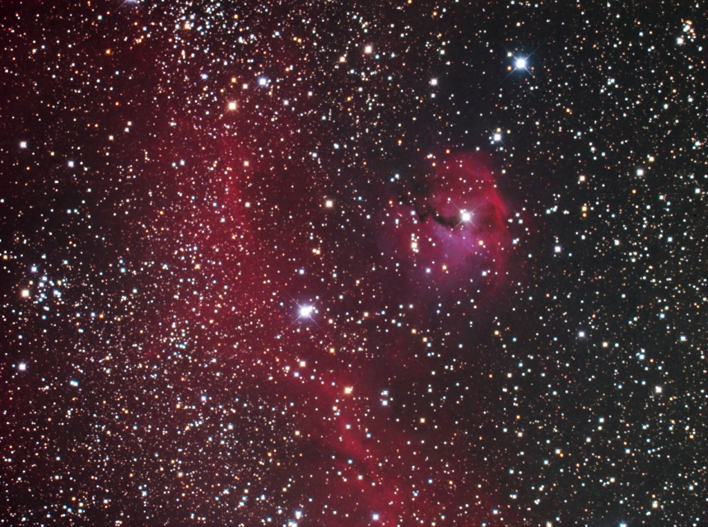 | IC2177 is the larger nebula complex on the left, commonly known as the Seagull nebula. Sh2-292 or Gum-1 is the nebula composed of the red emission nebula and blue reflection nebula. | |||